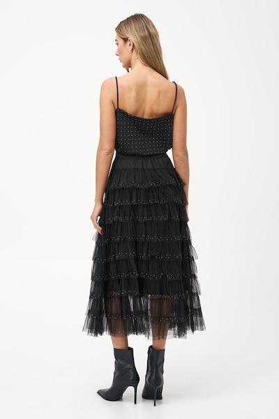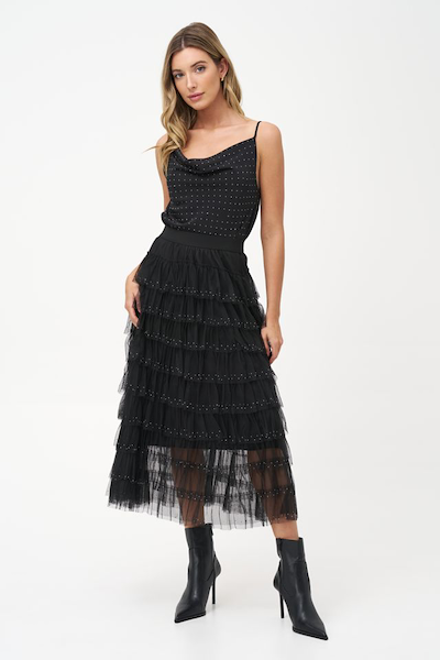 Camisole noir en satin avec des brillant un peu partout. Parfait pour compléter un look avec un morceaux qui sort de l'ordinaire.