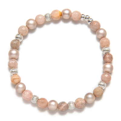 L'alliance éclatante de la pierre de soleil et de la nacre allie vitalité, clarté et grâce féminine. La pierre de soleil renforce la confiance, le courage et la joie, tandis que la nacre offre un doux éclat et une élégance intemporelle. Les touches métalliques texturées apportent une touche moderne, rendant ce bracelet à la fois délicat et distinctif.