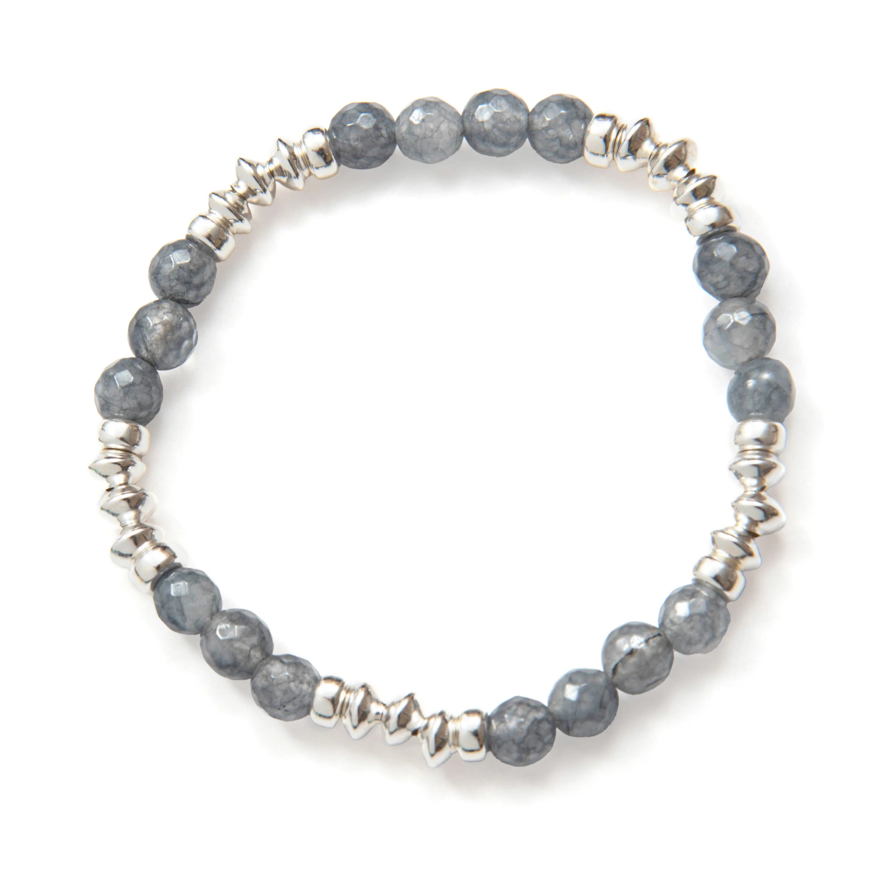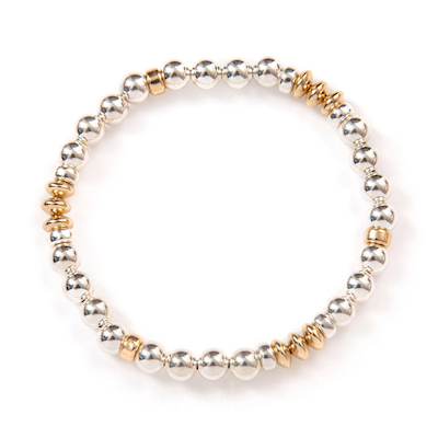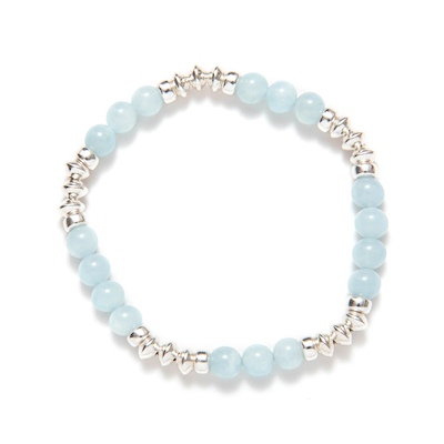 . Composé de perles d'aquamarine de 6 mm, ce bracelet se distingue par ses inserts métalliques, créant un effet texturé qui sublime l'ensemble. Les touches d'argent sterling ou de vermeil or 14 carats lui confèrent une finition élégante et moderne, idéale à superposer avec d'autres bracelets.