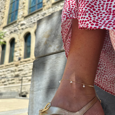 • Bracelet de cheville en argent sterling ou chaîne en vermeil doré 14 carats, nacre et fil coloré.