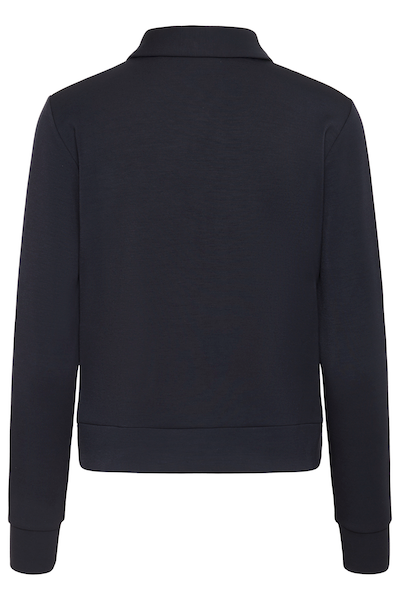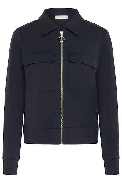 Pull en jersey bleu foncé avec fermeture éclair, poches poitrine, col et manches longues.