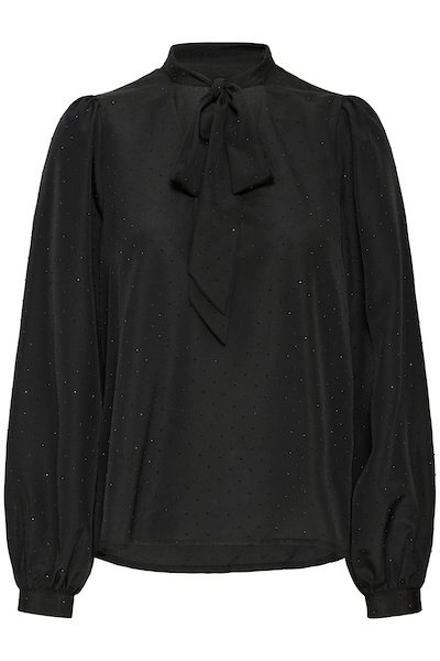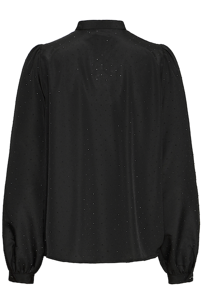 Chemisier noir à manches longues et brillant. Parfait pour les temps festif et les 5 à 7.