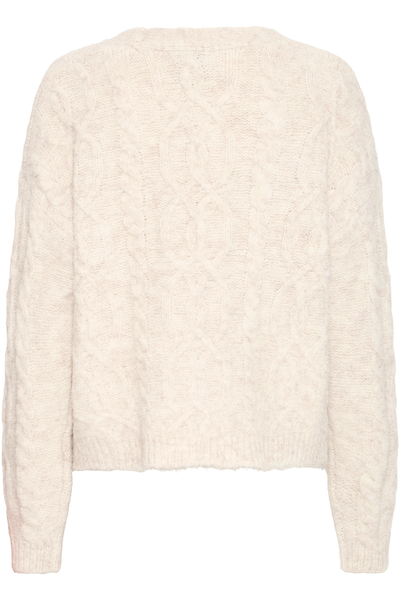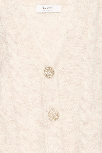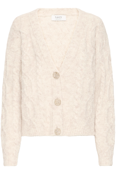 Cardigan beige à manches longues. Parfait pour compléter votre look avec douceur et élégance, tout en restant au chaud.