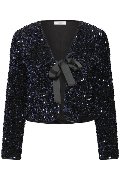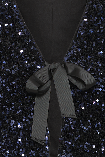 Cette veste courte à sequins pour femme présente une coupe cintrée, un décolleté en V plongeant, des manches longues et une fermeture à nœud pour un style raffiné. Pièce polyvalente, elle offre un confort optimal pour les soirées ou les occasions spéciales.