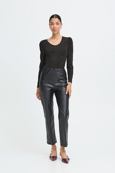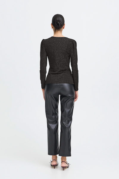 Chandail noir brillant avec encolure en «V» et manches longues. Parfait pour ajouter une touche de brillant à votre look, autant en mode décontracter que chic.