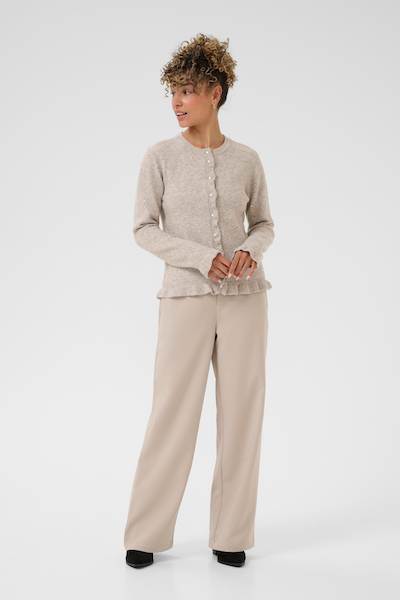 Ce cardigan présente une coupe droite, une encolure ronde et des manches longues. La fermeture sur le devant est munie de petits boutons et d'un léger volant le long de la patte de boutonnage et de l'ourlet, créant un délicat détail texturé sur l'ensemble du vêtement.