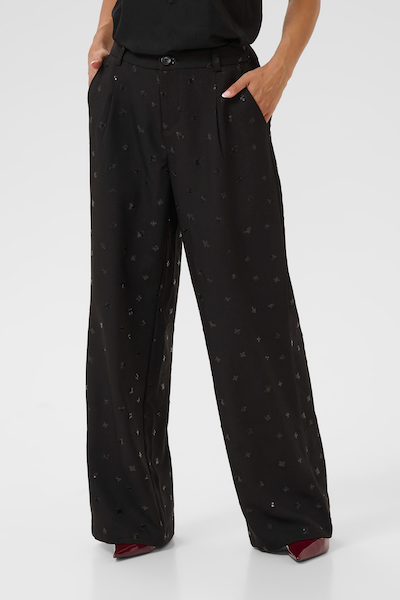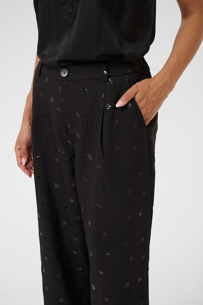 Pantalon tailleur à la coupe ample et décontractée, ceinture classique et détails de sequins discrets. Idéal pour les occasions formelles et les soirées, il offre confort et silhouette élégante pour un style polyvalent.