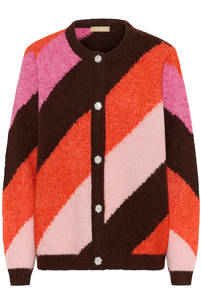 Cardigan à manches longue rayé en diagonale rose, brun, oranger et beige. Parfait pour ajouté de la couleur et une touche «funcky» à son look.