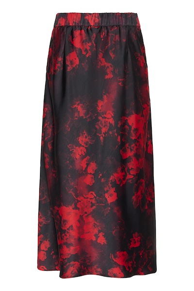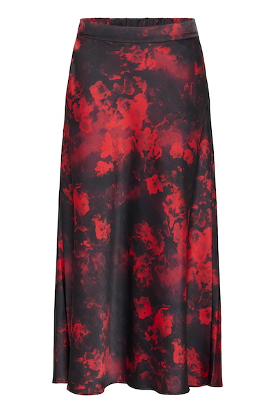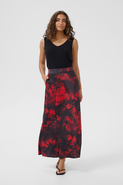 Jupe à imprimer noir et rouge. Parfait pour ajouter de la couleur à votre look. Cette jupe peut autant fair chic que décontracté.