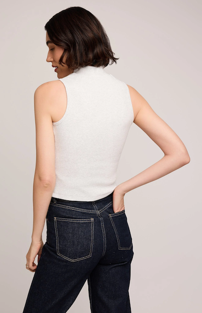 Le débardeur Michelle est confectionné en coton et viscose côtelé d'épaisseur moyenne. Son col montant et sa coupe légèrement raccourcie facilitent les superpositions.