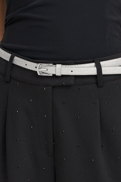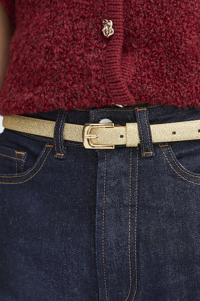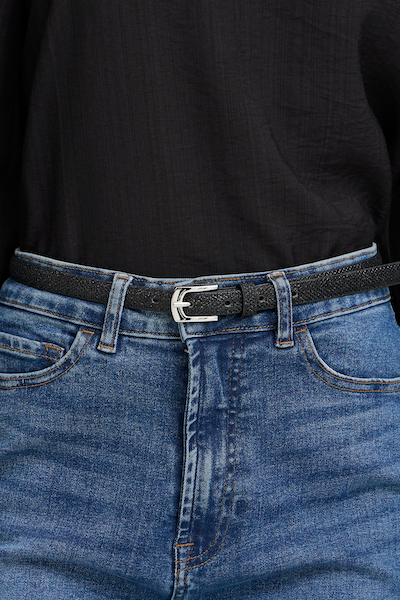 Ceinture fine à la finition texturée et chatoyante, ornée d'une boucle métallique polie. Ses lignes épurées et ses détails minimalistes lui confèrent une touche raffinée et moderne, idéale pour sublimer toutes vos tenues.