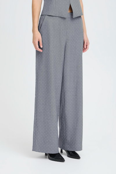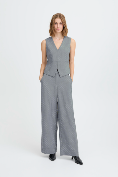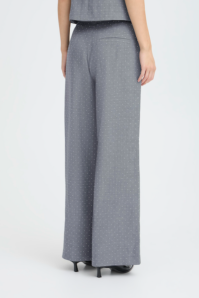 Pantalon à jambes larges, coupe structurée et taille haute angulaire. Un subtil motif à pois apporte du relief. Ses lignes nettes et sa longueur totale lui confèrent une allure moderne et élégante.