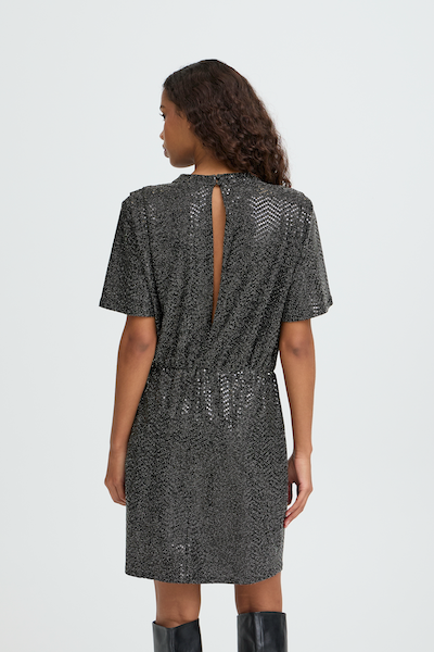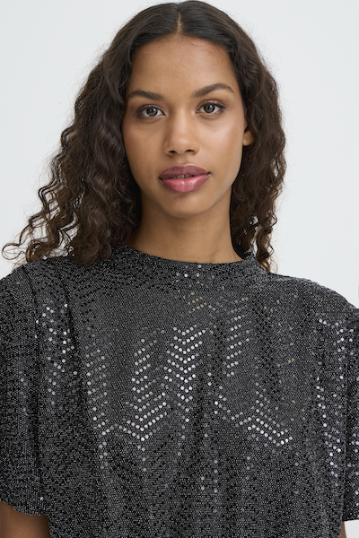 Robe noir brillante à manches courtes, ample avec ajustement à la taille. Parfait pour un look chic, tout en étant confortable.