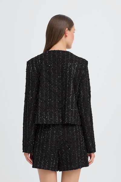 Veste courte à sequins, coupe droite, finition texturée et manches longues. Encolure ronde épurée et subtilement scintillante.