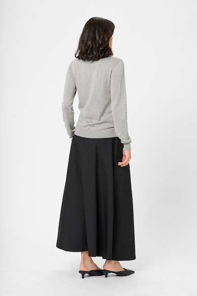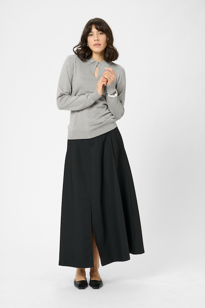 Ce haut en maille à manches longues présente une coupe ajustée, des poignets et un ourlet côtelés, un col pointu avec une découpe en forme de larme et une bordure scintillante soulignant le col et l'encolure pour un style résolument moderne.