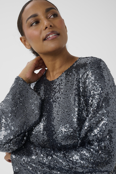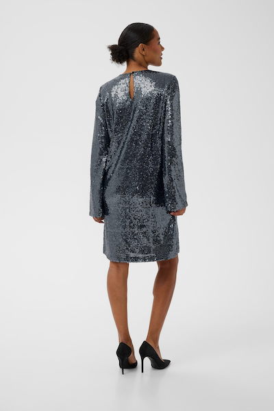 Robe à sequins à la silhouette droite et décontractée, avec un fini scintillant sur toute la surface. Encolure ronde, manches longues et longueur au-dessus du genou.