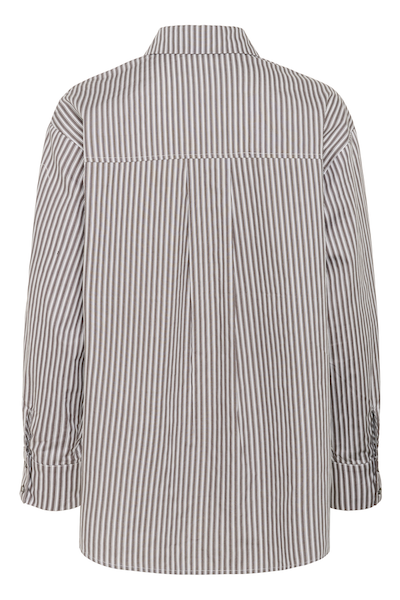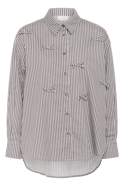 Chemisier ligné gris et blanc à l'horizontale, avec des petites boucle à l'avant. Parfait pour ajouter une touche coquette à votre look tout en restant tendance.