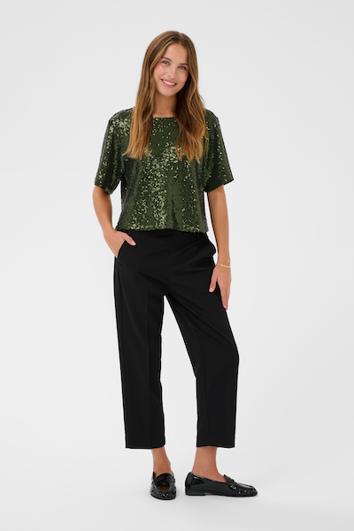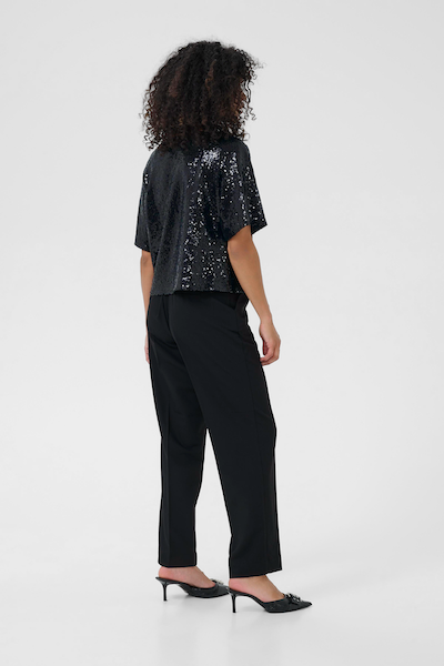 Haut à sequins à la coupe carrée et aux manches courtes. Encolure ras du cou et coupe courte, entièrement recouvert de sequins scintillants pour un effet accrocheur.