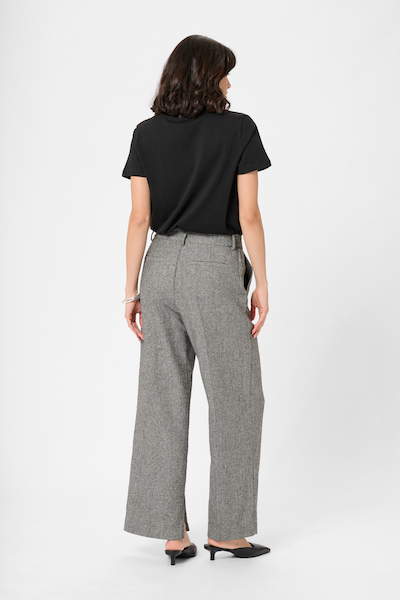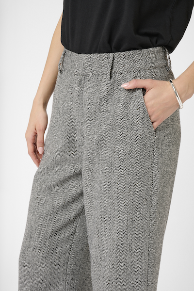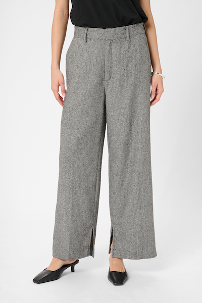 Pantalon large à la silhouette droite, avec taille ajustée et fentes discrètes à l'ourlet. La texture à chevrons apporte une touche raffinée au modèle.