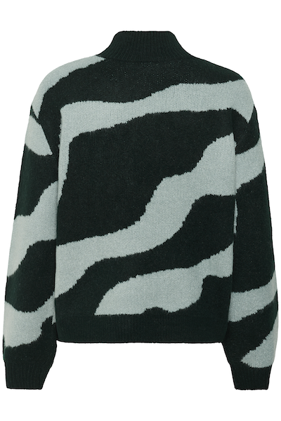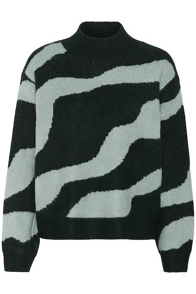 Pull en maille noir et gris clair avec un motif abstrait de vagues. Il présente une encolure haute côtelée, des manches longues et une coupe droite en maille douce et texturée.