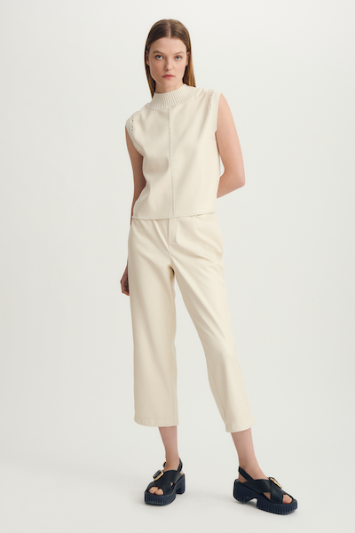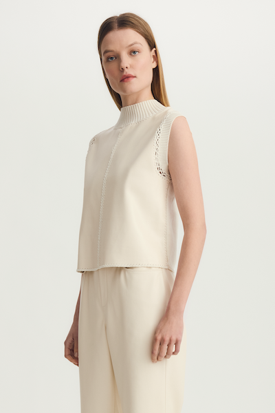 Haut sans manches crème avec les coutures en tricot et le reste en cuire. Parfait pour compléter un look et ajouter une touche chic.