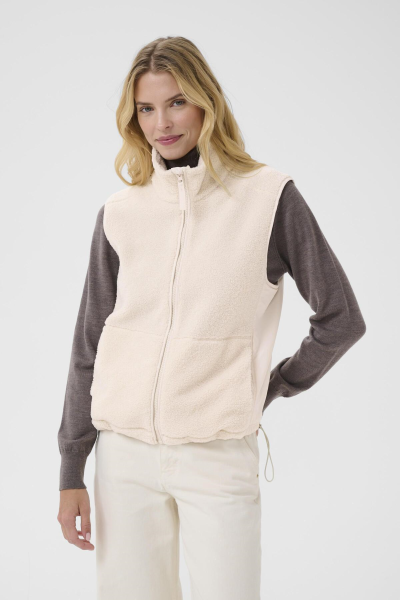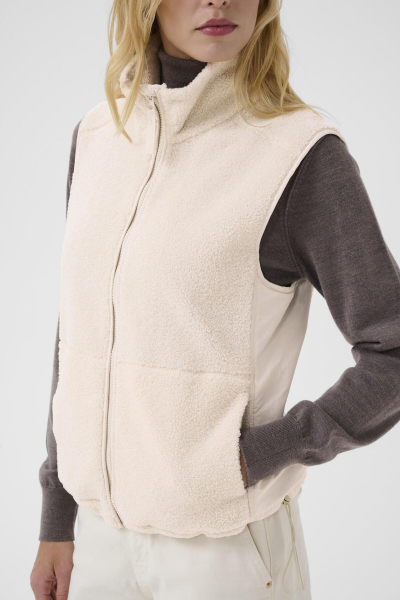 Veste sans manche crème en texture de mouton sur l'extérieur. Ajustable au niveau des hanche, avec deux poches sur les côtés. Parfait pour se réchauffer durant les mi-saison et ajoute une touche sportive au look.