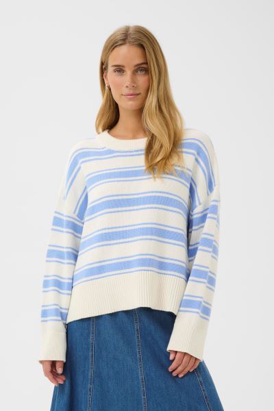 Le mannequin mesure 174 cm et porte une taille M. Ce pull rayé bleu et crème présente une coupe décontractée avec des épaules tombantes et de larges finitions côtelées, lui conférant une allure douce et décontractée. Parfait au quotidien avec un jean ou porté sur une robe pour un look à la fois décontracté et élégant.