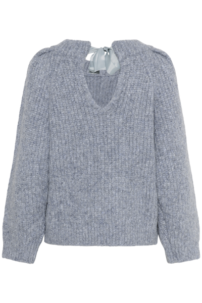 Chandail bleu gris à manches longues en lainage qui s'attache avec une boucle dans le dos. Parfait pour ajouter une touche de délicatesse au look.