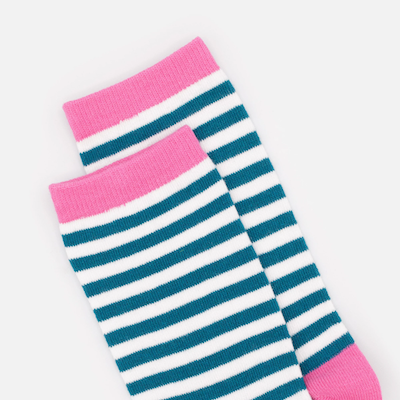 Apportez une touche de pep’s à vos looks avec ces chaussettes à rayures blanches et sarcelles, twistées par des détails roses éclatants. Des bas tendance qui combinent style et confort, parfaits pour dynamiser vos tenues du quotidien.