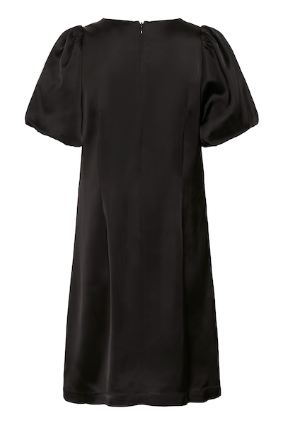 Robe en satin noir avec encolure en «V» et manche un peu bouffante. Parfait pour avoir un look chic en discrétion.