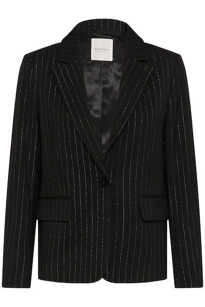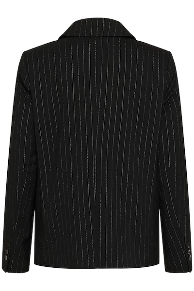 Veston noir avec des ligne verticale argenté. Parfait pour les événements ou pour avoir un look chic avec une touche de paillette.