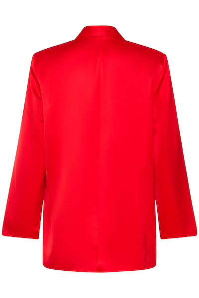 Veston rouge en satin à manches longues. Parfait pour compléter votre look de soirée avec une touche de couleur.